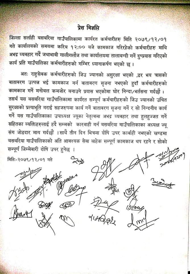 कर्मचारी माथी अभद्र व्यवहार पछी कर्मचारीहरुकाे बिरोध , दोषीलाई कारवाहीको माग